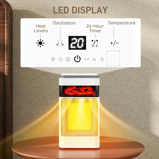 HOMCOM Ceramic Electric Heater, 1500W Fan Space Heater with 3 Modes, 24H Timer, Flame Effect, Oscillation, White