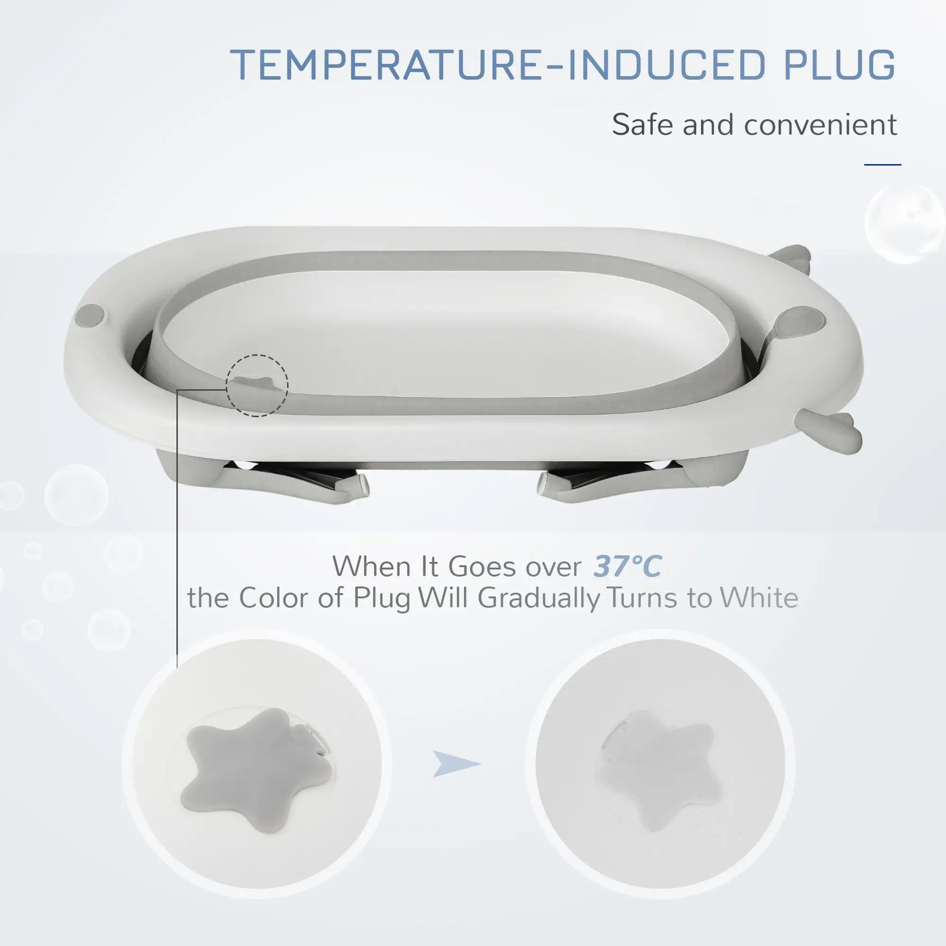 TEMPERATURE WARNING PLUG: Our Baby Bathtub Comes Equipped with a Temperature-Sensing Water Plug. It's Designed To Keep Your Baby Safe By Changing Colour as a Warning If The Water Temperature Exceeds 37°C, Ensuring a Comfortable and Secure Bathing Experience.