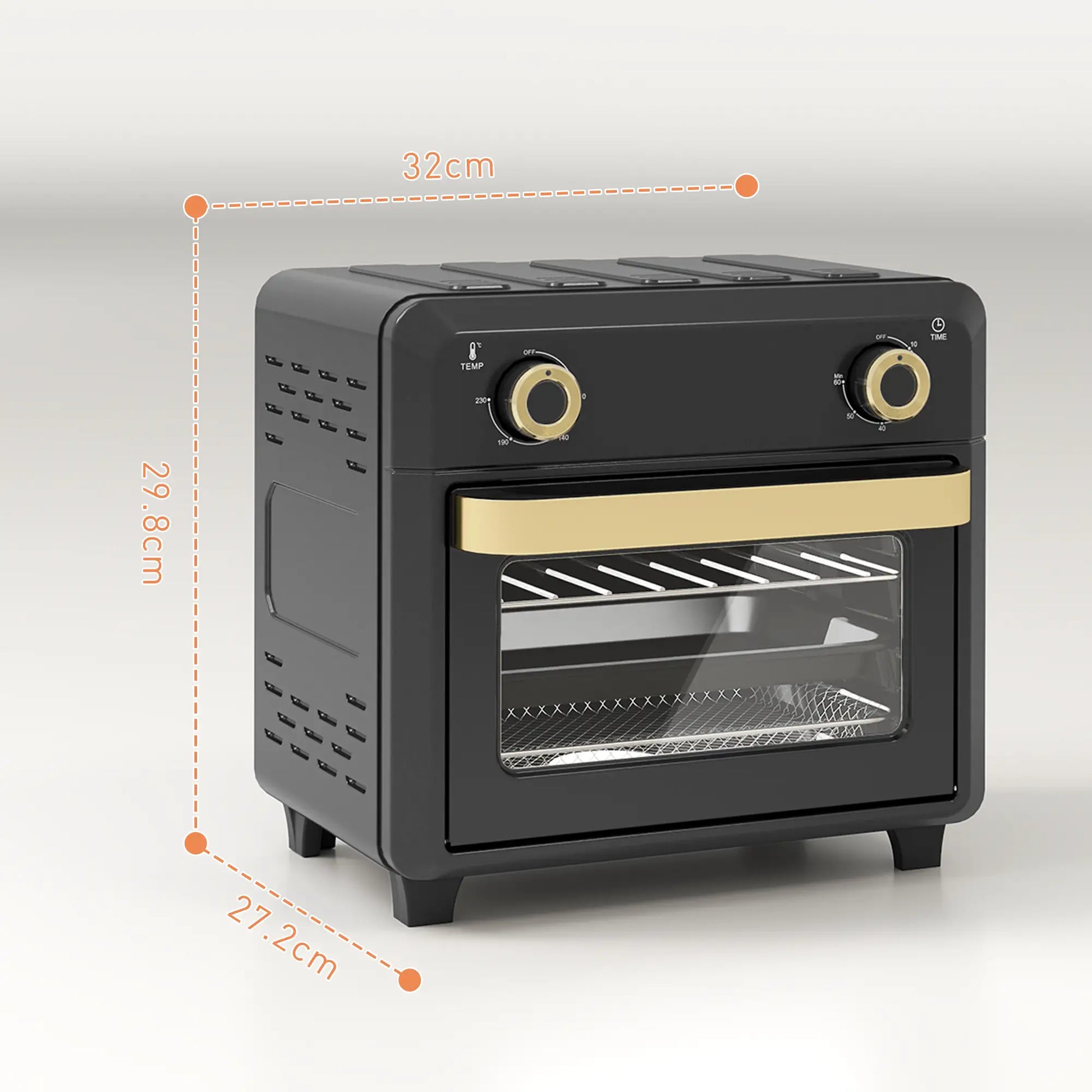 - Overall Dimensions: 32w x 27.2d x 29.8hcm. Comes with a Fry Basket, Oven Rack, Baking Pan, Tray Handle and Crumb Tray, All Dishwasher Safe For Easy Cleaning. PFOA and BPA free.