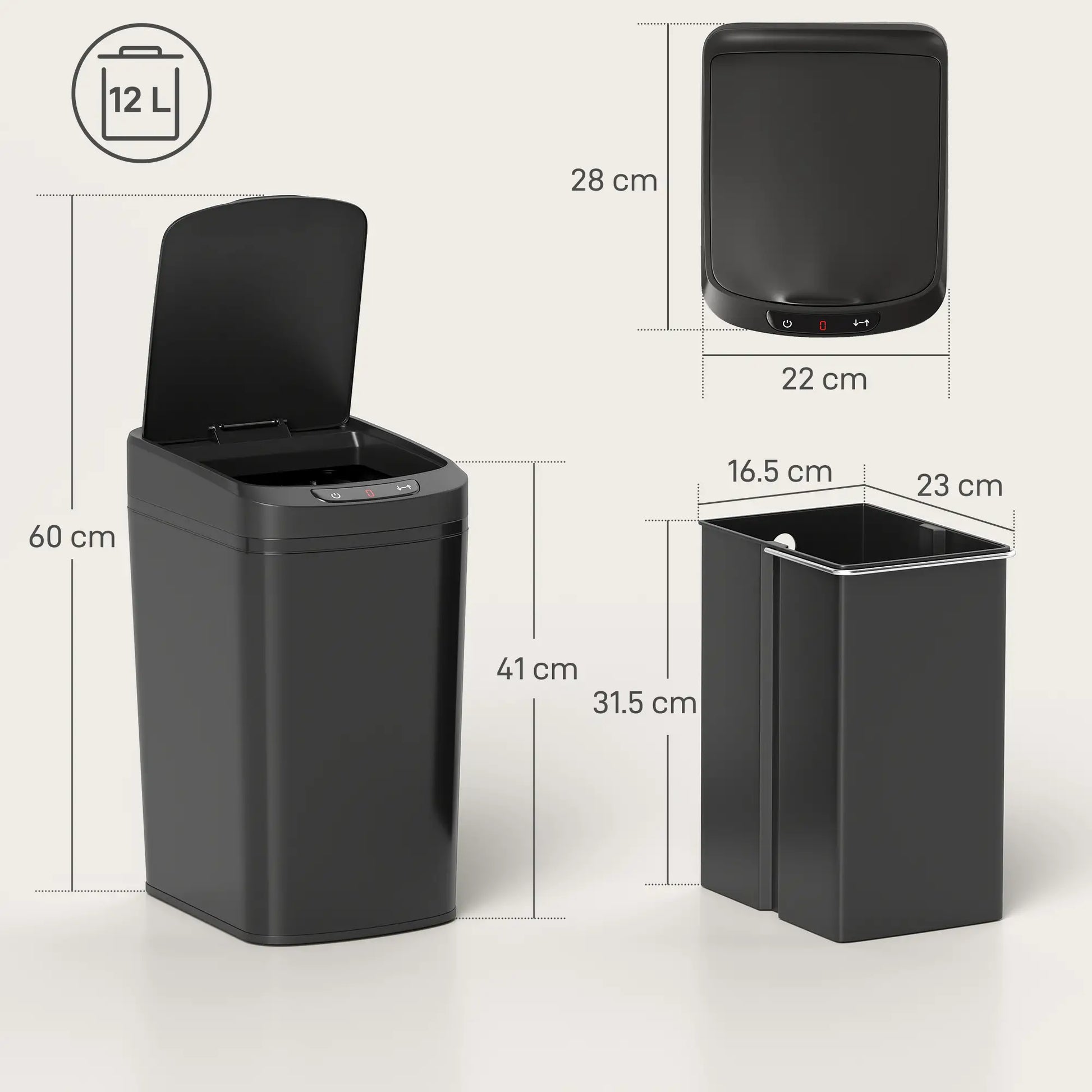 COMPACT FOOTPRINT, FAMILY-READY CAPACITY: With Its Space-Saving Form and Practical 12 L Capacity, This Sensor Bin Fits Seamlessly Into Modern Kitchens. A 60 cm Opening Height and Touch-Top Access Reduce Bending, Keeping Daily Disposal Clean and Effortless