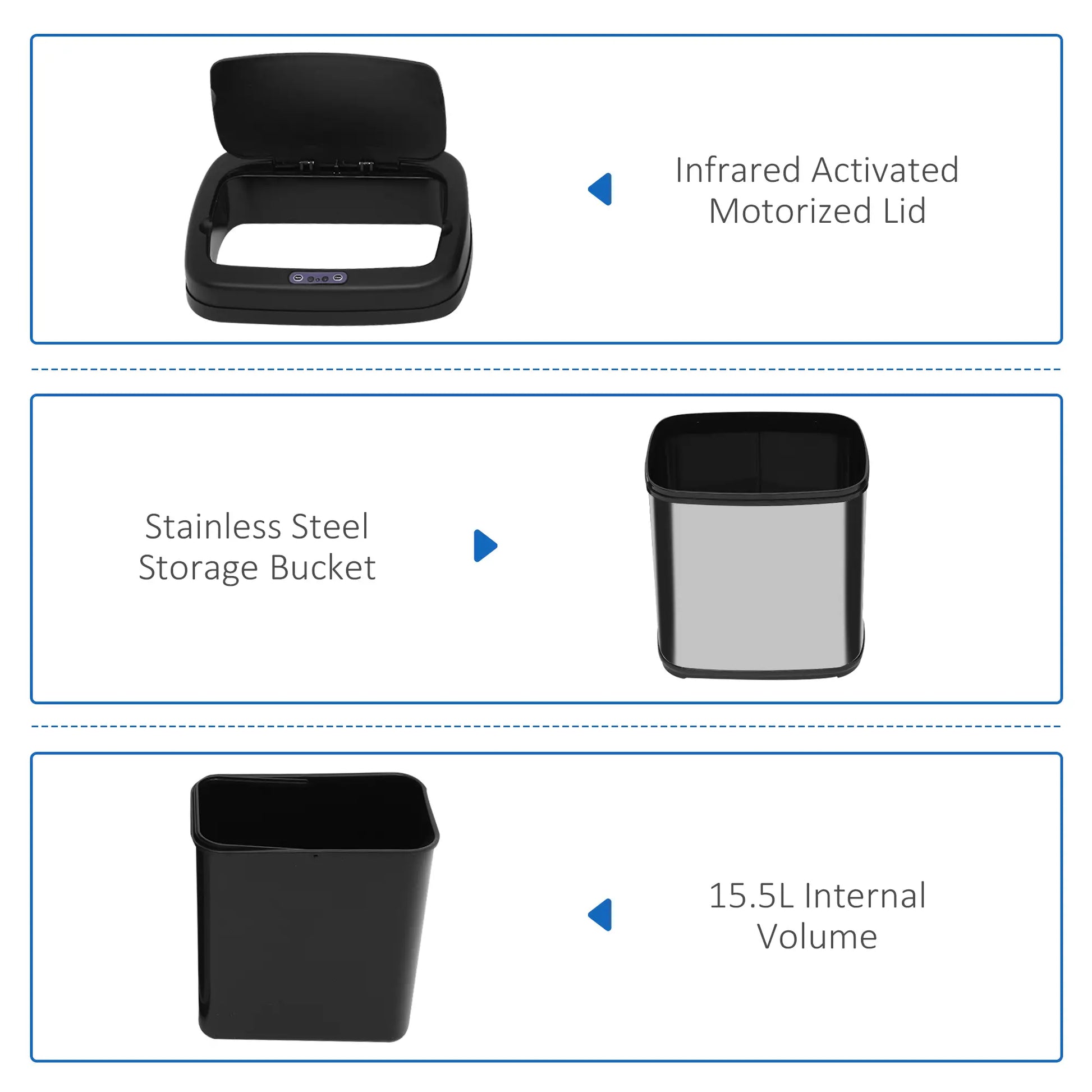 - Use Infrared Technology, So Wave Hand In Front To Open Lid Automatically; Can Also Be Operated Manually By Pressing Buttons On The Lid.