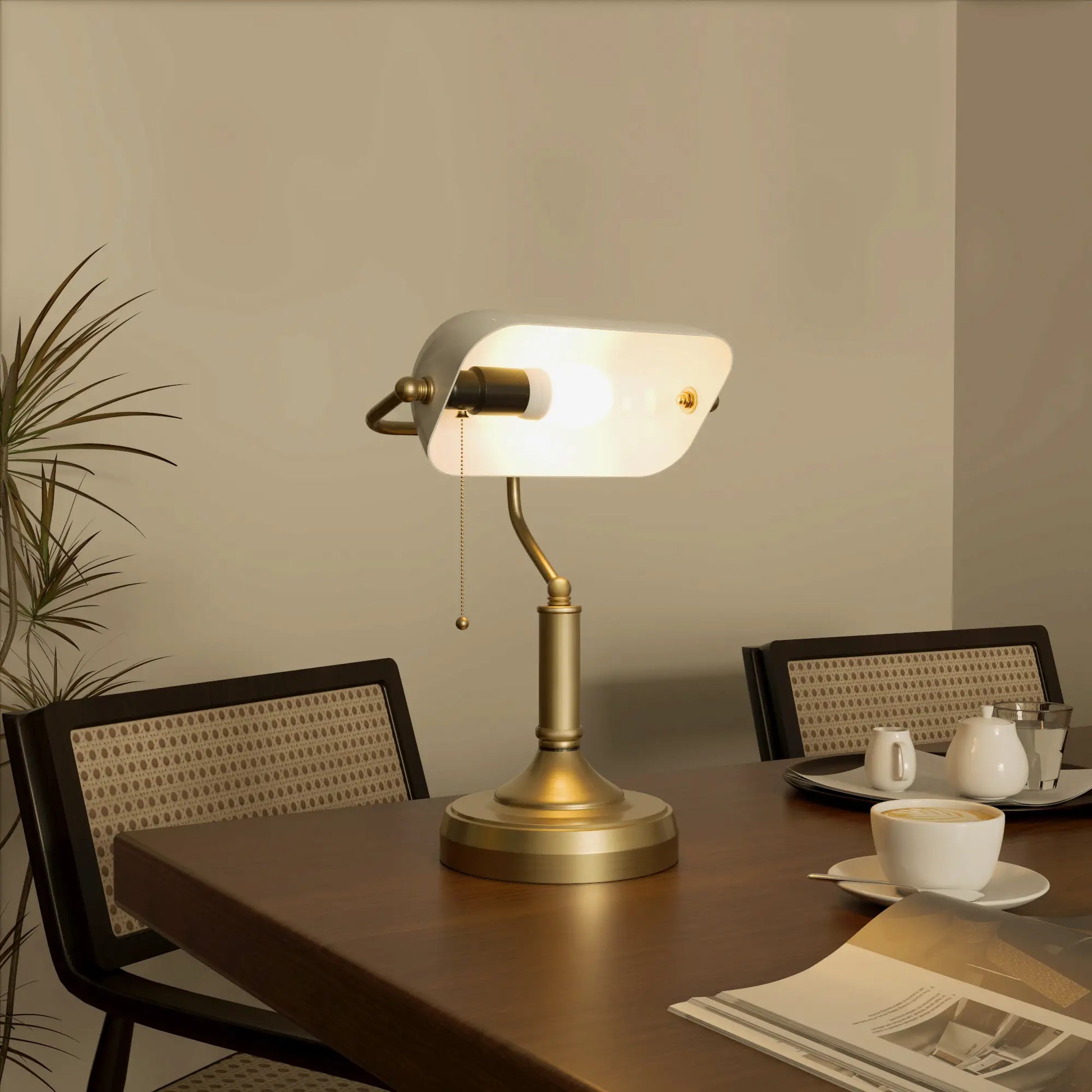 - Classic Banker's Style: Desk Lamp With Traditional Style and Vintage Flair. Features A Slender Body and Flared Base with a Lovely, Polished Brass Tone Finish and a White Glass Shade. Suitable For A Home Office.