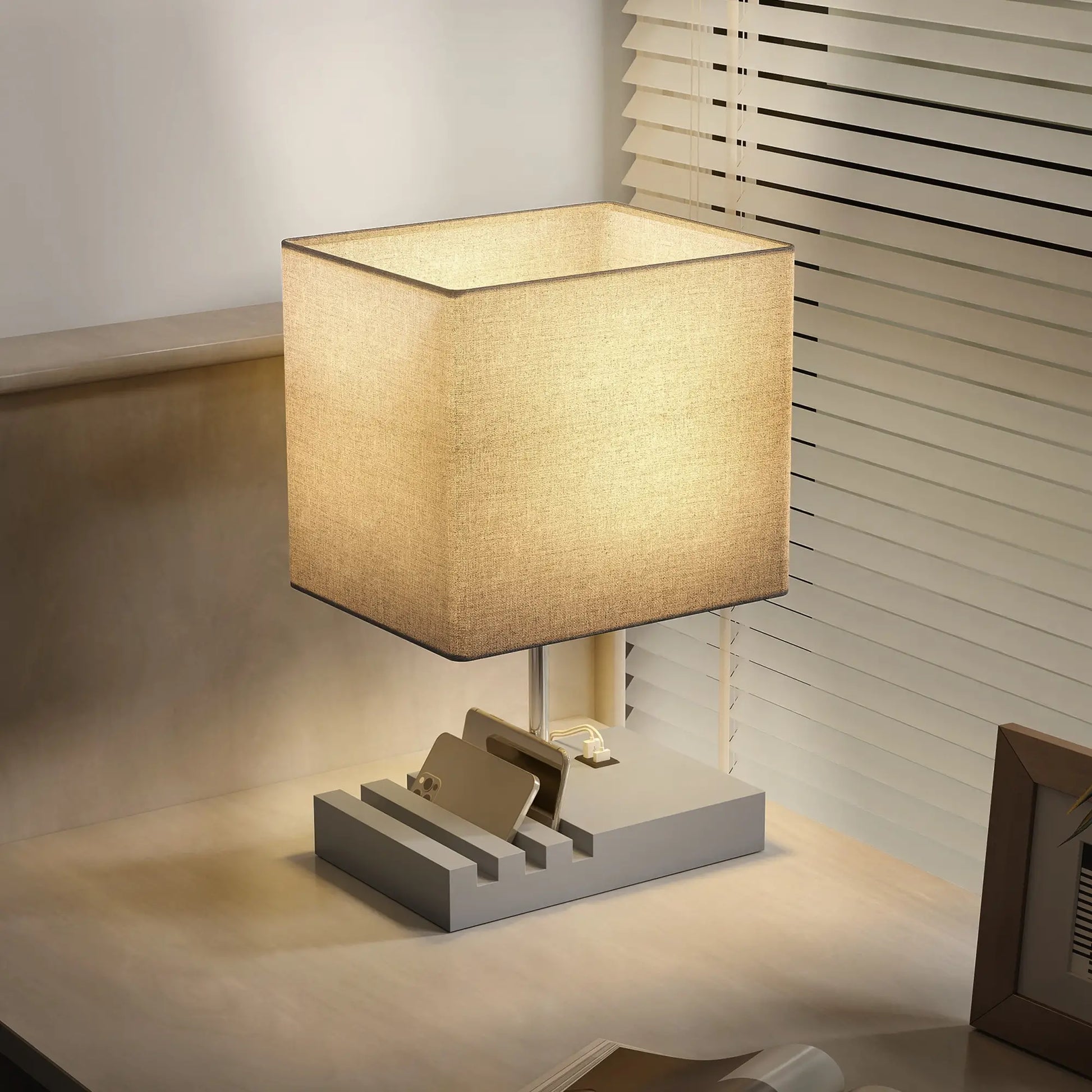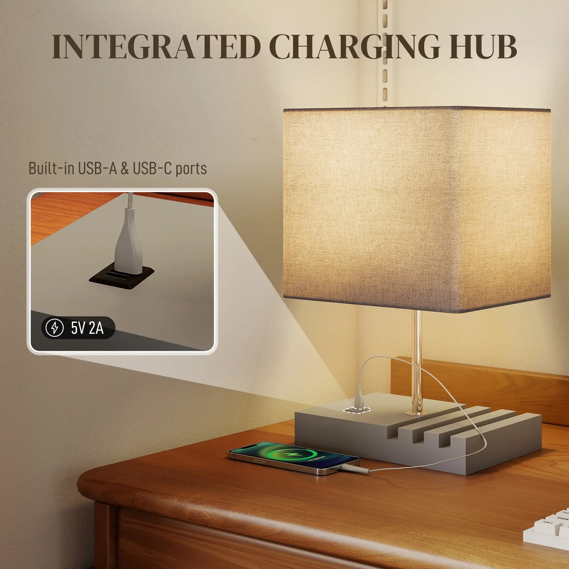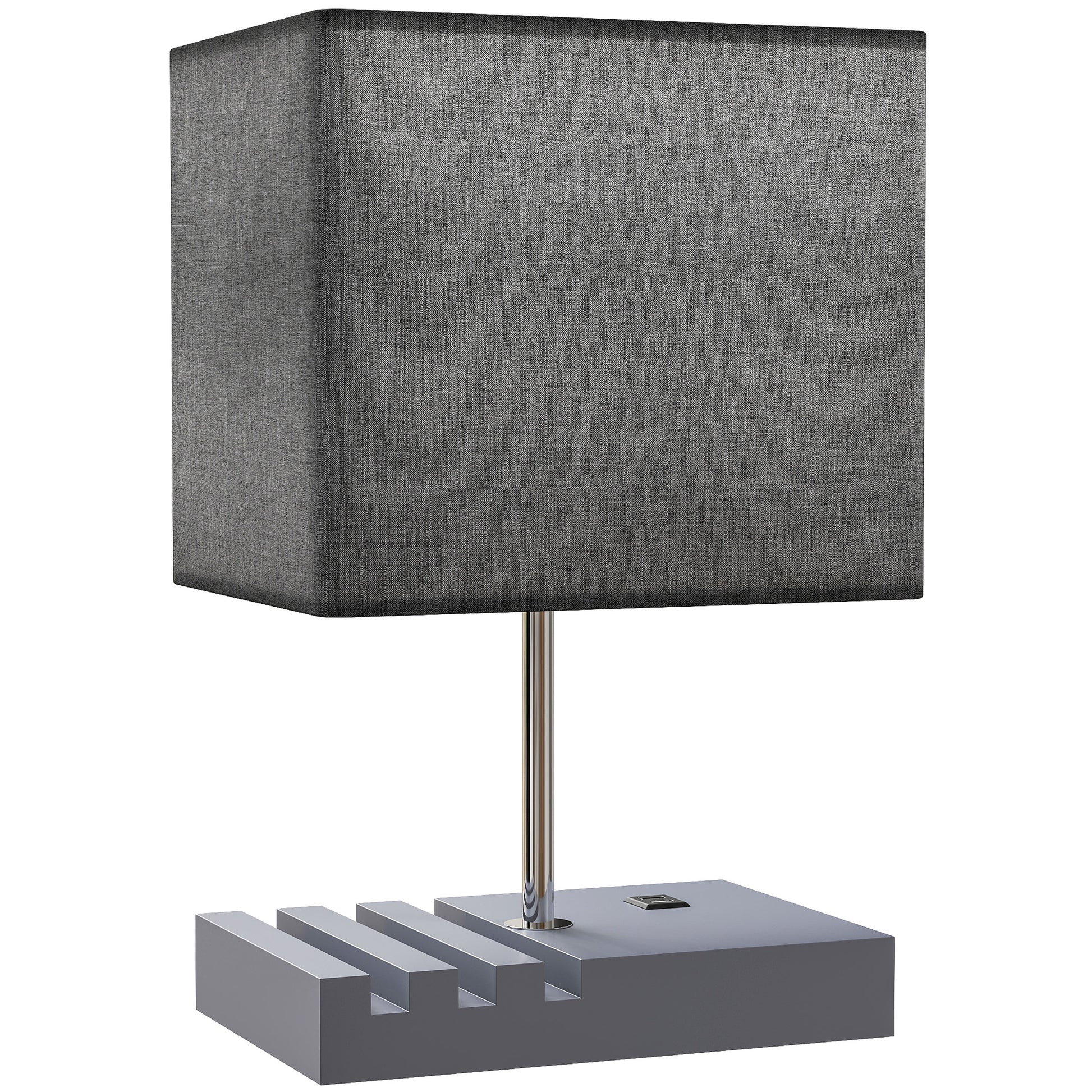 HOMCOM Bedside Lamp with USB A+C Charging Ports & 3 Phone Stands, Table Lamp with Wood Base, Grey