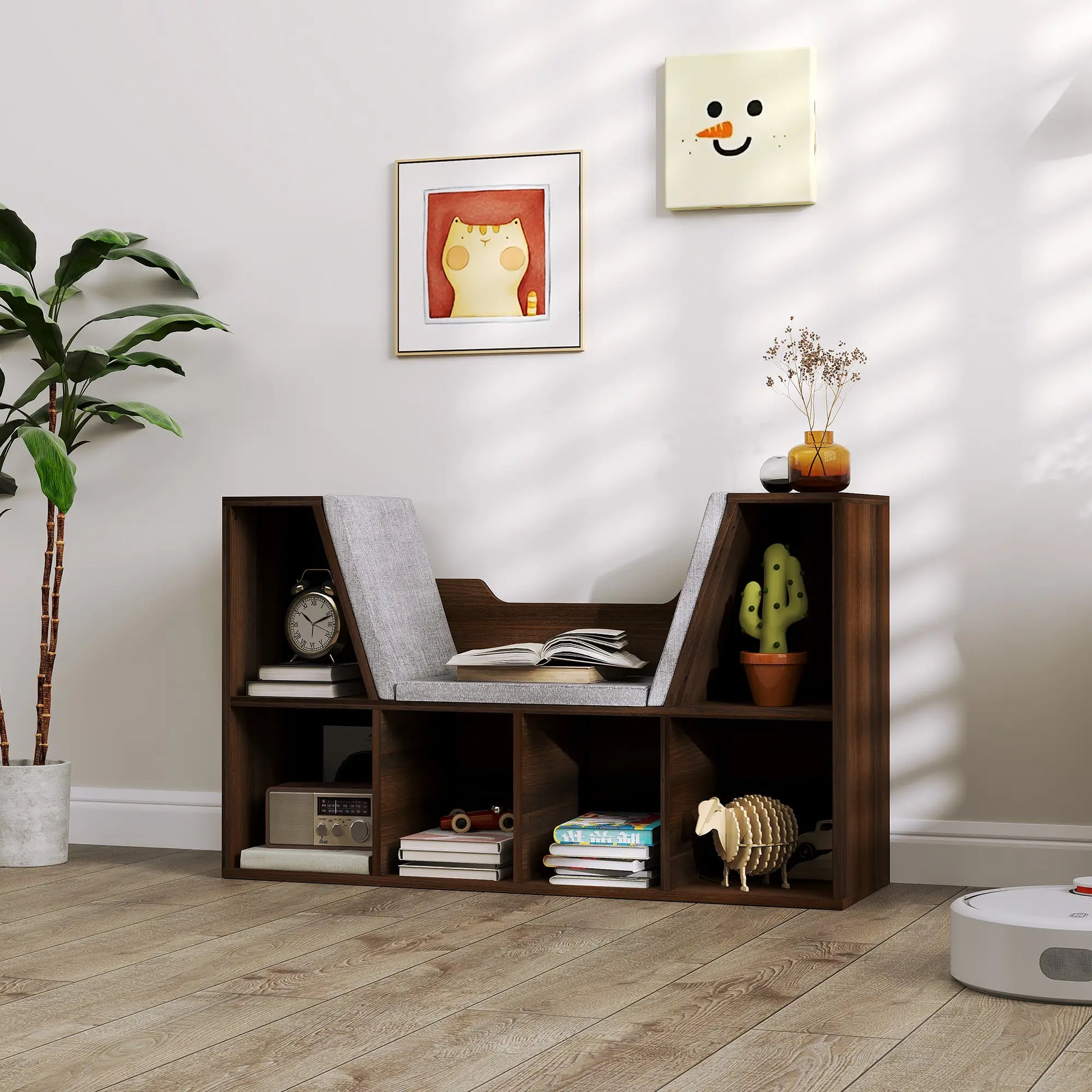 HOMCOM Bookcase Storage Shelf with Cushioned Reading Seat, Cube Bookshelf Organizer for Bedroom Living Room, Chestnut
