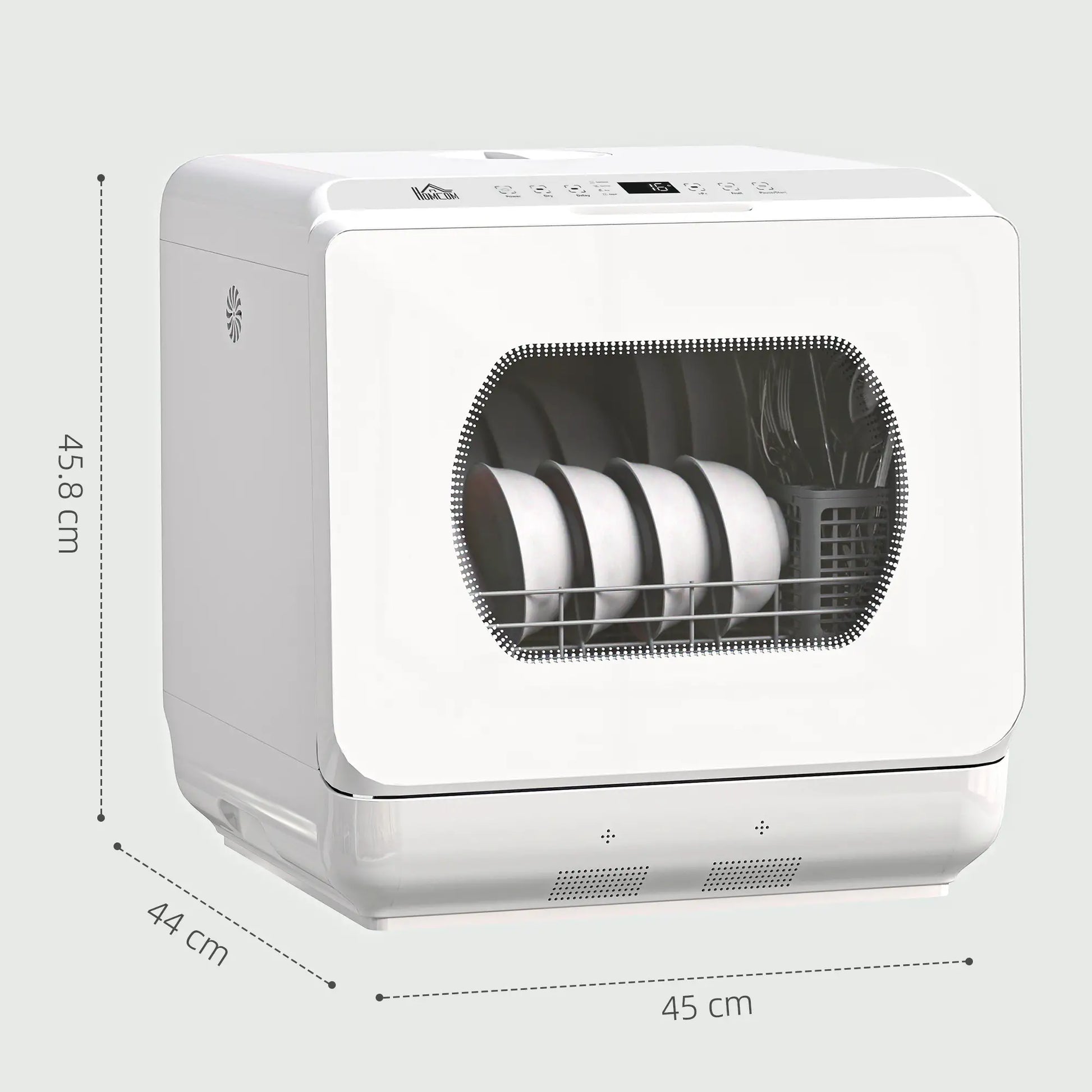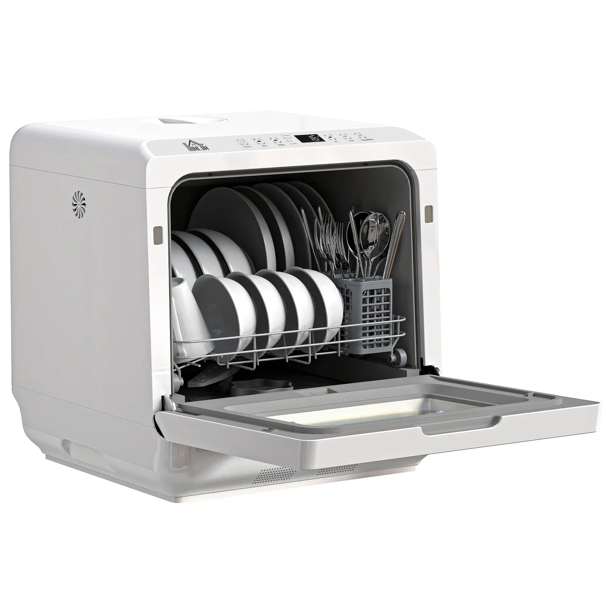 Say Goodbye To The Hassle Of Manual Dishwashing, Anywhere, with This HOMCOM Tabletop Dishwasher! It Has Six Programmes: Intensive, Efficient, Normal, Rapid, Fruit Wash and Drying. The Efficient Spray Arm Ensures Sparkling Clean Dishes Every Time. A Compact Dishwasher, Suitable For Four-Person Households.