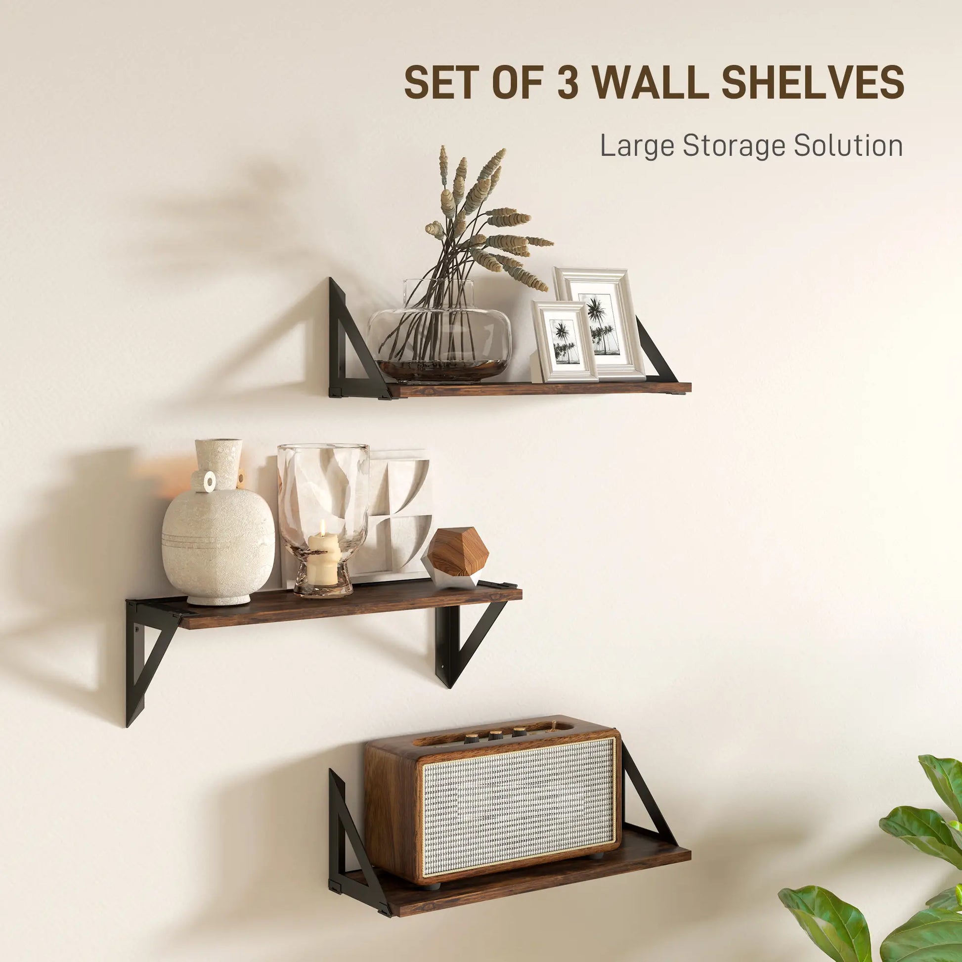 HOMCOM Set of 3 Wall Shelves, Vintage Wall Mounted Floating Shelves for Living Room, Bedroom, Rustic Brown