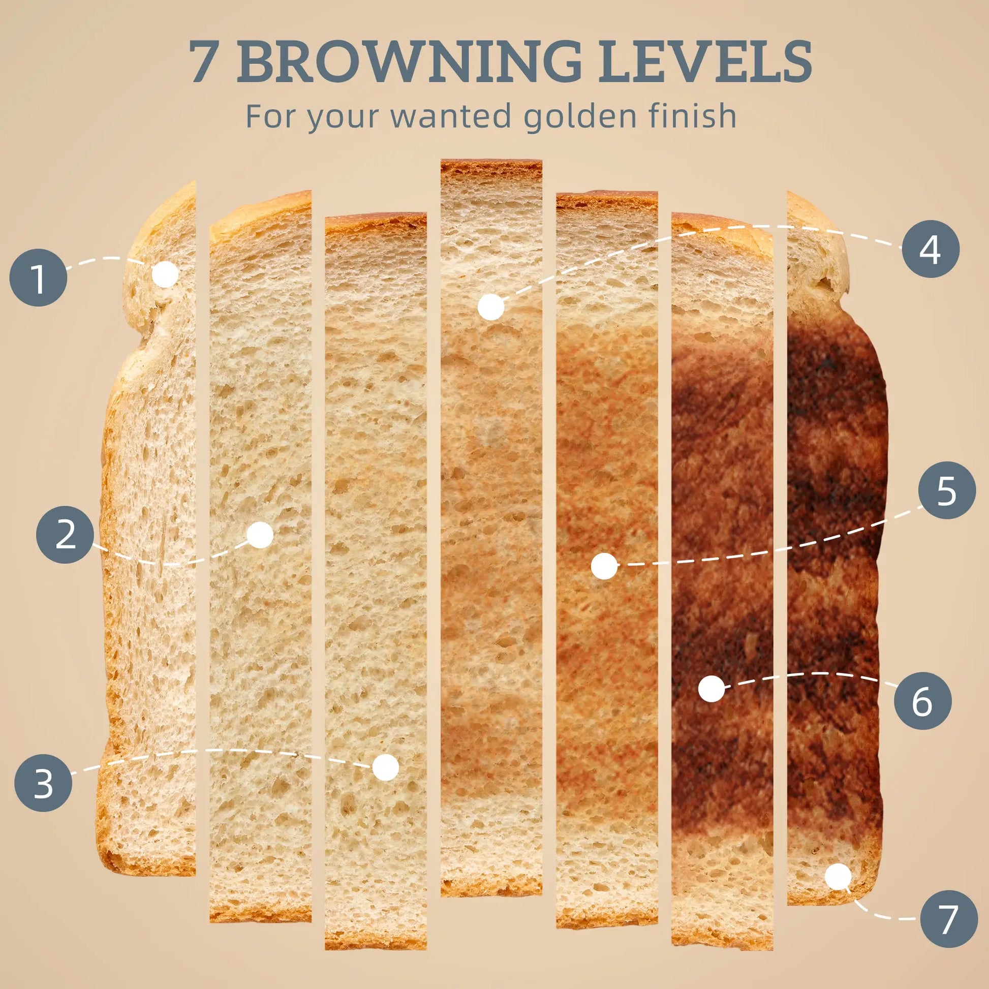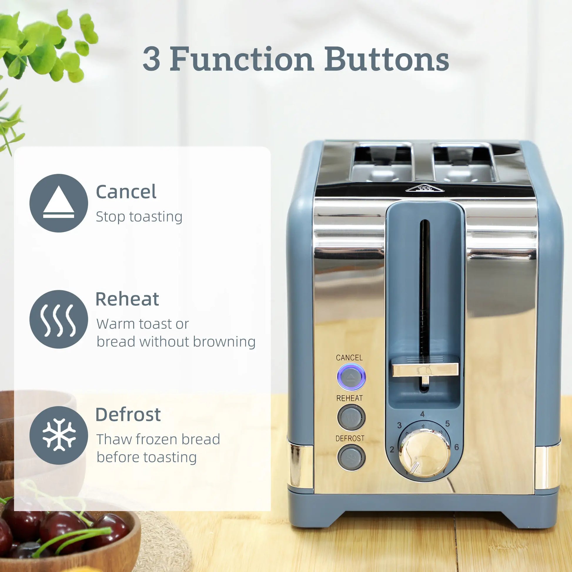 1080W SEVEN-LEVEL TOASTER: Brown Bread How You Like It. Two-Slice Toaster Has A Defrost, Reheat and Cancel Function. Wide 3.5 Cm Slots Take Thick Bread, Auto-Centres For Even Toasting and Pops Up When Done.