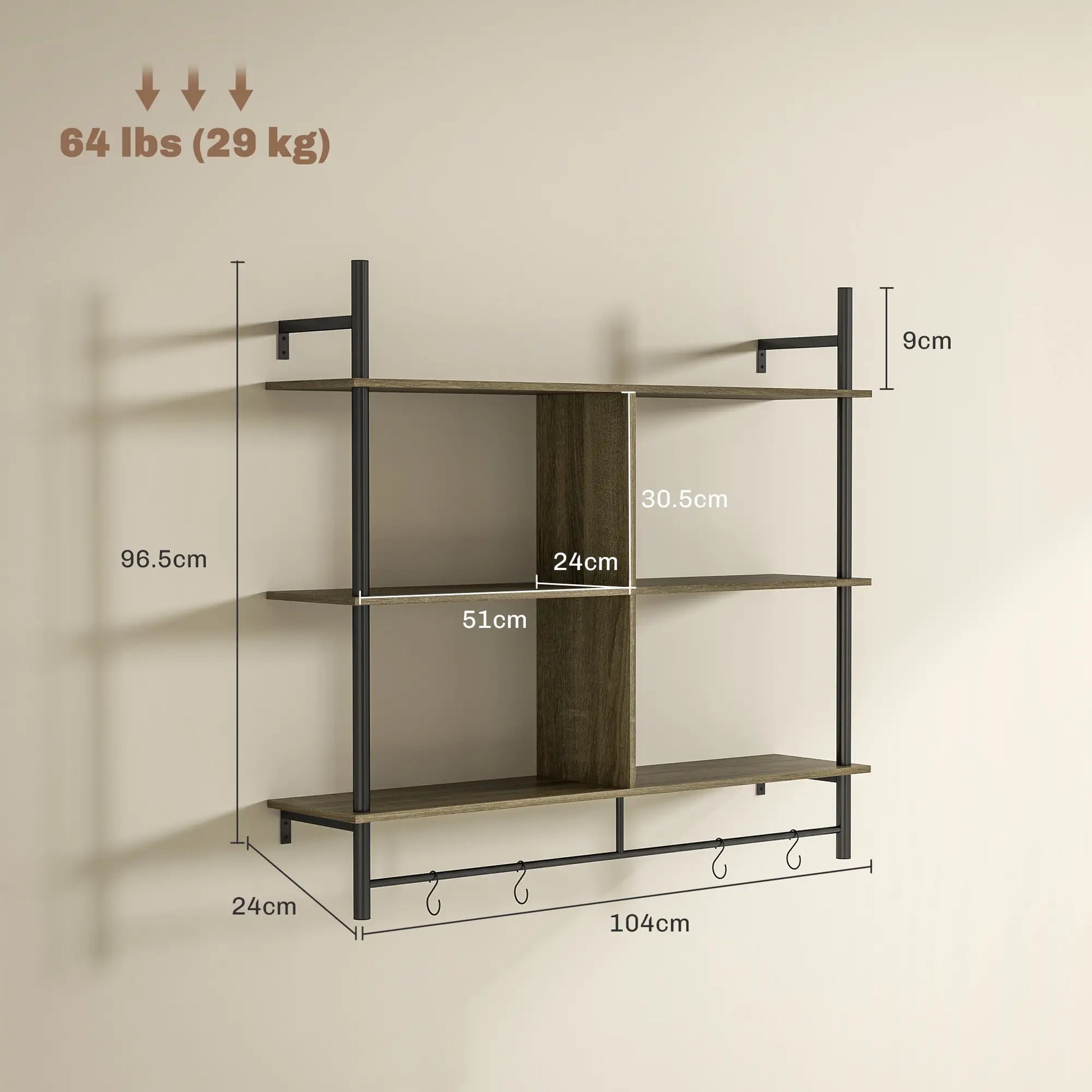 Save Space By Displaying Your Favourite Pieces with This HOMCOM Floating Shelf. The Three-Tier Design Means It Offers Plenty, with Four 's' Shaped Hooks For Additional Hanging Space. A Steel Frame Means a Strong Core, with Guardrails On The Top Shelf For Safety. Now You Just Need To Choose Where You Want To Set It Up.