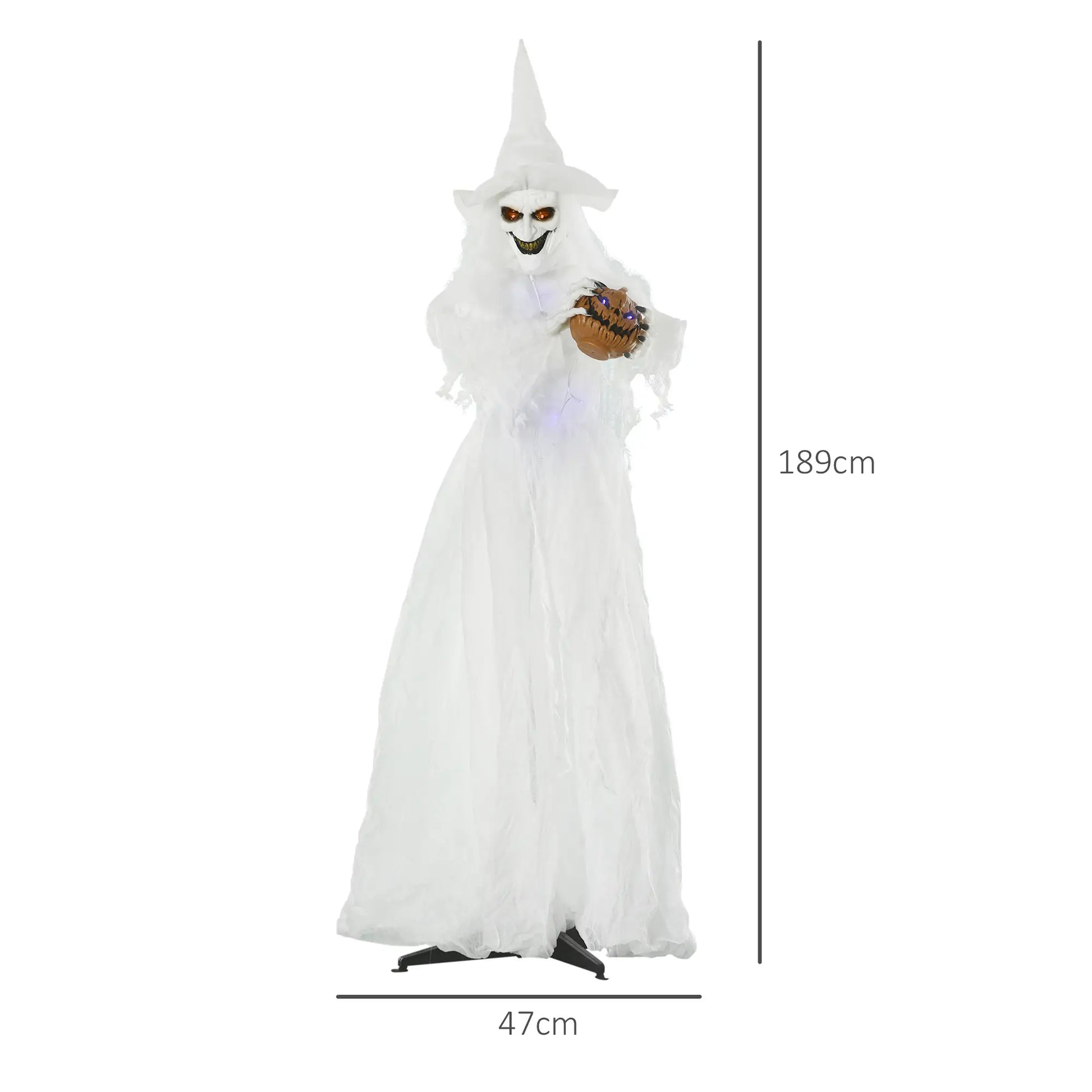 Outsunny Halloween Decorations White Witch Holding Pumpkin Head, Ghost Prop with Light Up Eyes & Body