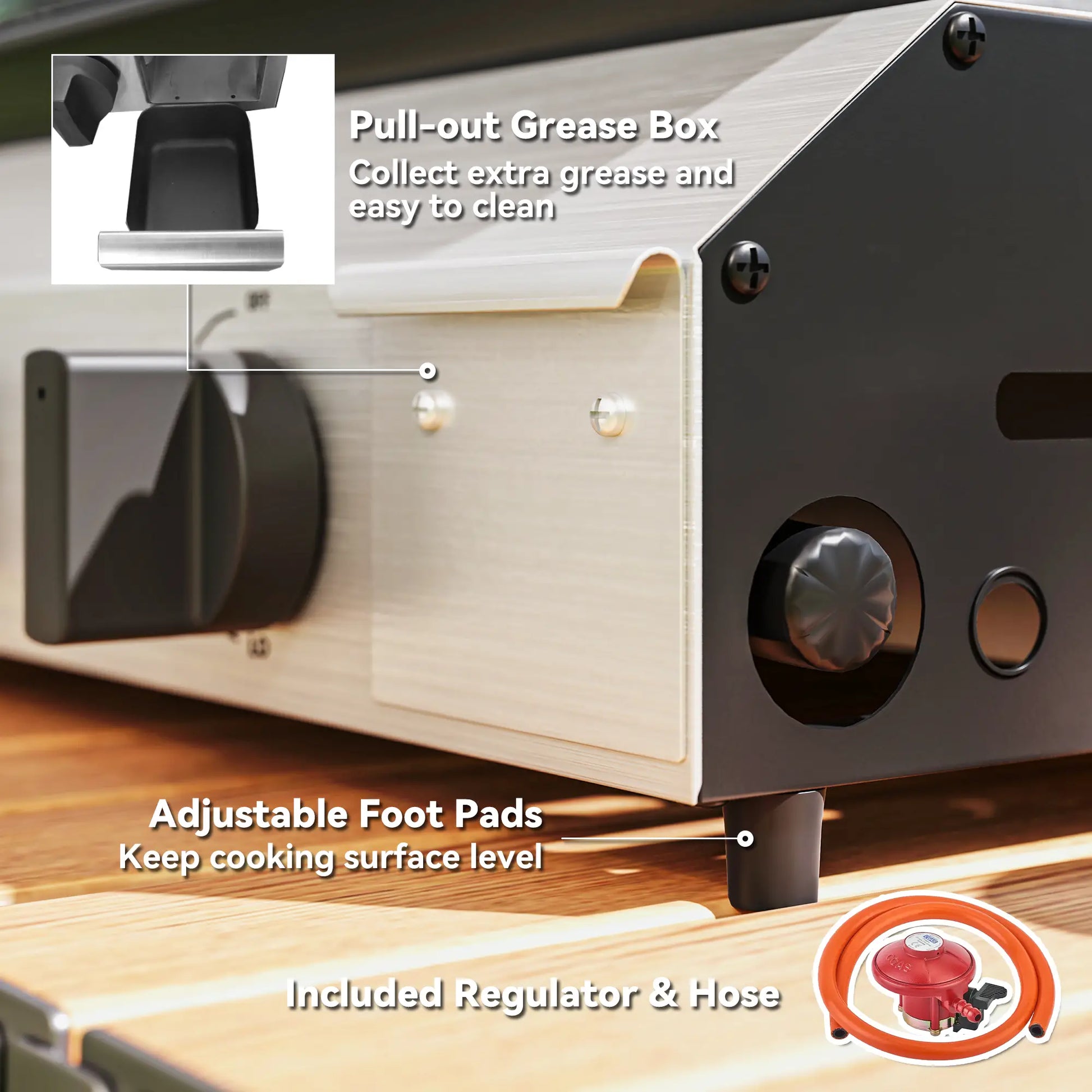GREASE COLLECTION BOX: Extra Cooking Oil and Liquids Flow Through The Drainage Hole On The Side Of The Plate. Pulls Out - Easy To Clean.